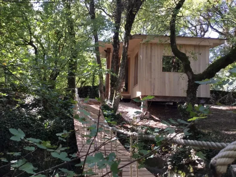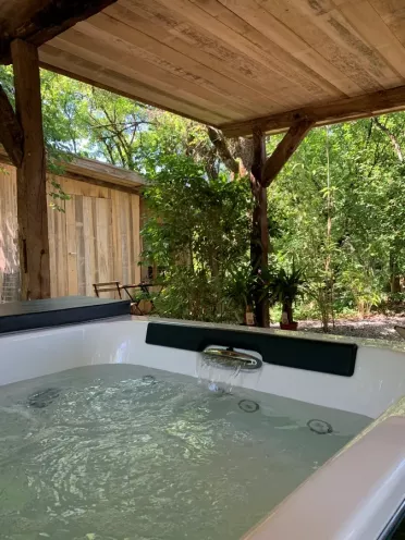 Nous vous invitons à venir découvrir, pour une ou plusieurs nuitées, en toute quiétude, une cabane avec spa jacuzzi privatif, nichée dans les arbres, dans un joli coin de nature de la propriété alliant art de vivre écologique dans le respect de la nature avec un confort d'excellence.